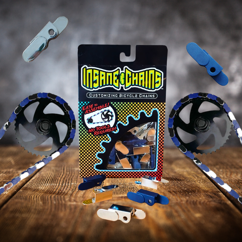 Add a touch of cool confidence to your single-speed ride with Insane Chains Chrome & Blue Caps. This sleek combination pairs the premium shine of chrome with a vibrant, classic blue, creating a look that is both clean and timeless. It’s the ultimate style upgrade for any single-speed bike—from a modern cruiser to a performance BMX. And with our tool-free, snap-on design, you can get a custom look in seconds while protecting your clothes from messy chain grease.