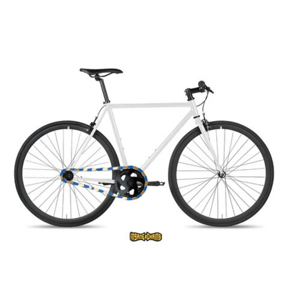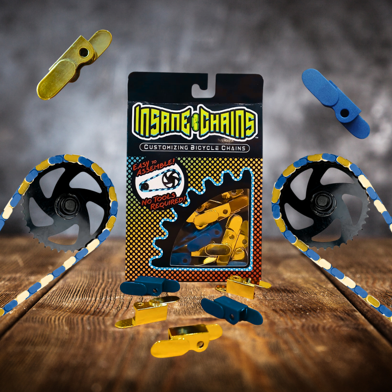 Give your single-speed ride a dose of classic cool with Insane Chains Gold & Blue Caps. This bold unisex bicycle accessory pairs the premium shine of gold with a vibrant, classic blue, creating a look that is both sophisticated and timeless. Perfect for any single-speed, fixed-gear, or BMX bike for both adults and kids. With our tool-free, snap-on design, you can get a custom look in seconds while protecting your clothes from messy chain grease.