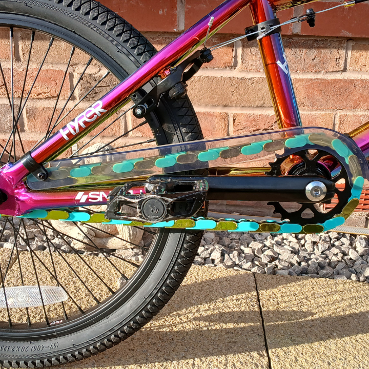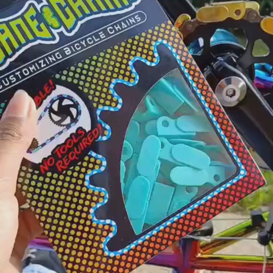 Add a touch of cool confidence to your single-speed ride with Insane Chains Gold & Teal Caps. This sleek and modern unisex bicycle accessory pairs the premium shine of gold with a vibrant, watery teal, creating a style that is both luxurious and refreshing. Perfect for single-speed, fixed-gear, or BMX bikes for both adults and kids. Our tool-free, snap-on design lets you customize your ride in seconds while also protecting clothes from messy chain grease.