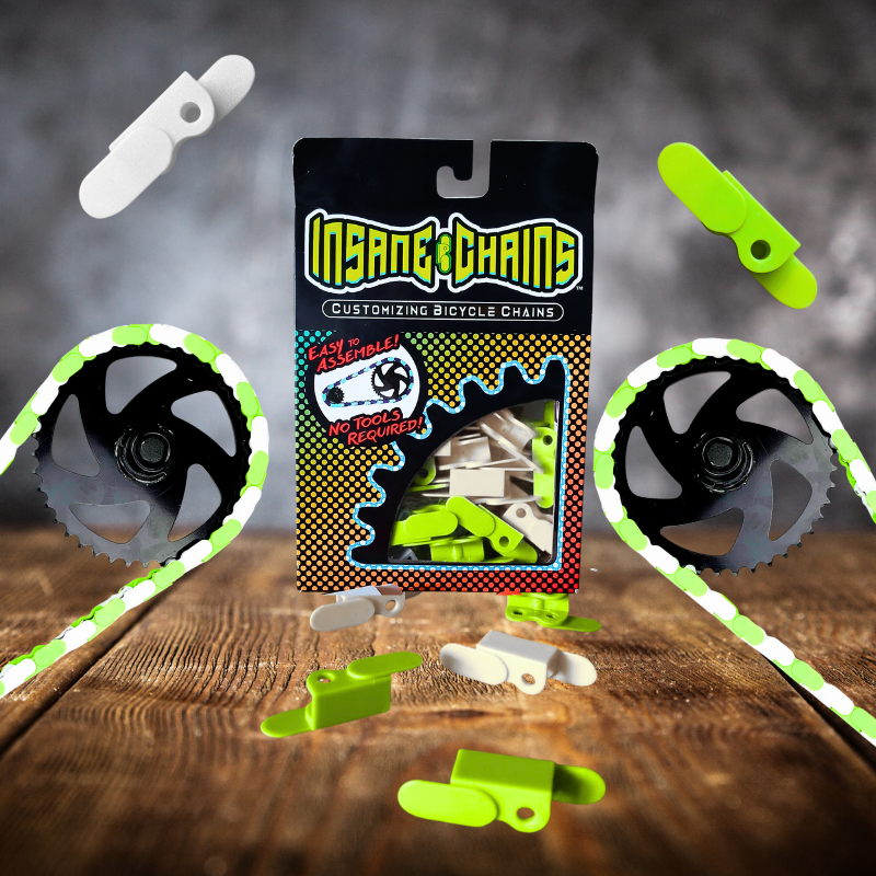 A single speed bike chain does not have to look plain. With Insane Chains Green & White Two Tone snap-on caps, you can transform your chain into a bold feature that gets noticed on every ride. The clean mix of crisp white and bright green adds a sharp, modern look that pops whether you are at the park, on the street, or riding with friends.